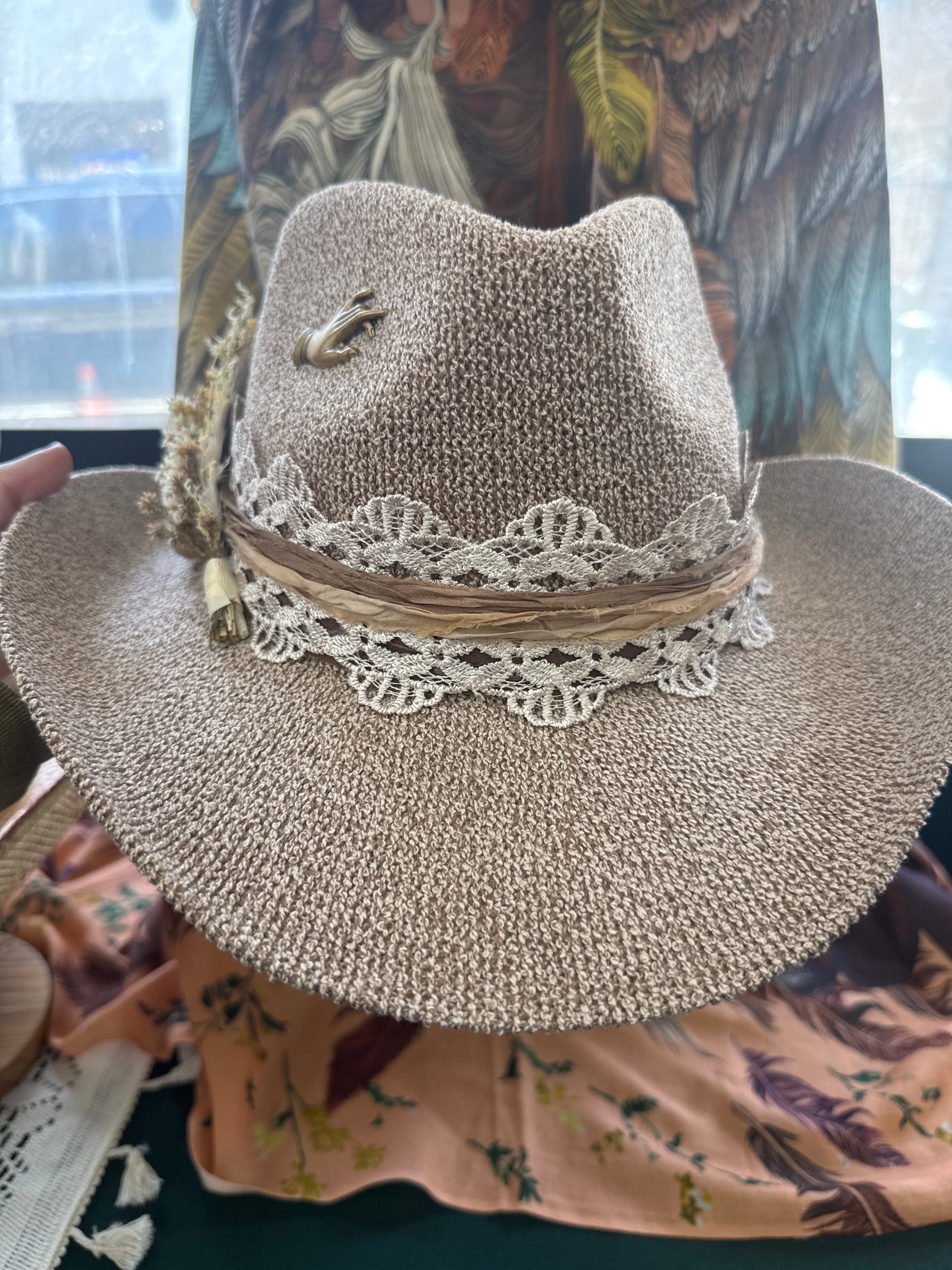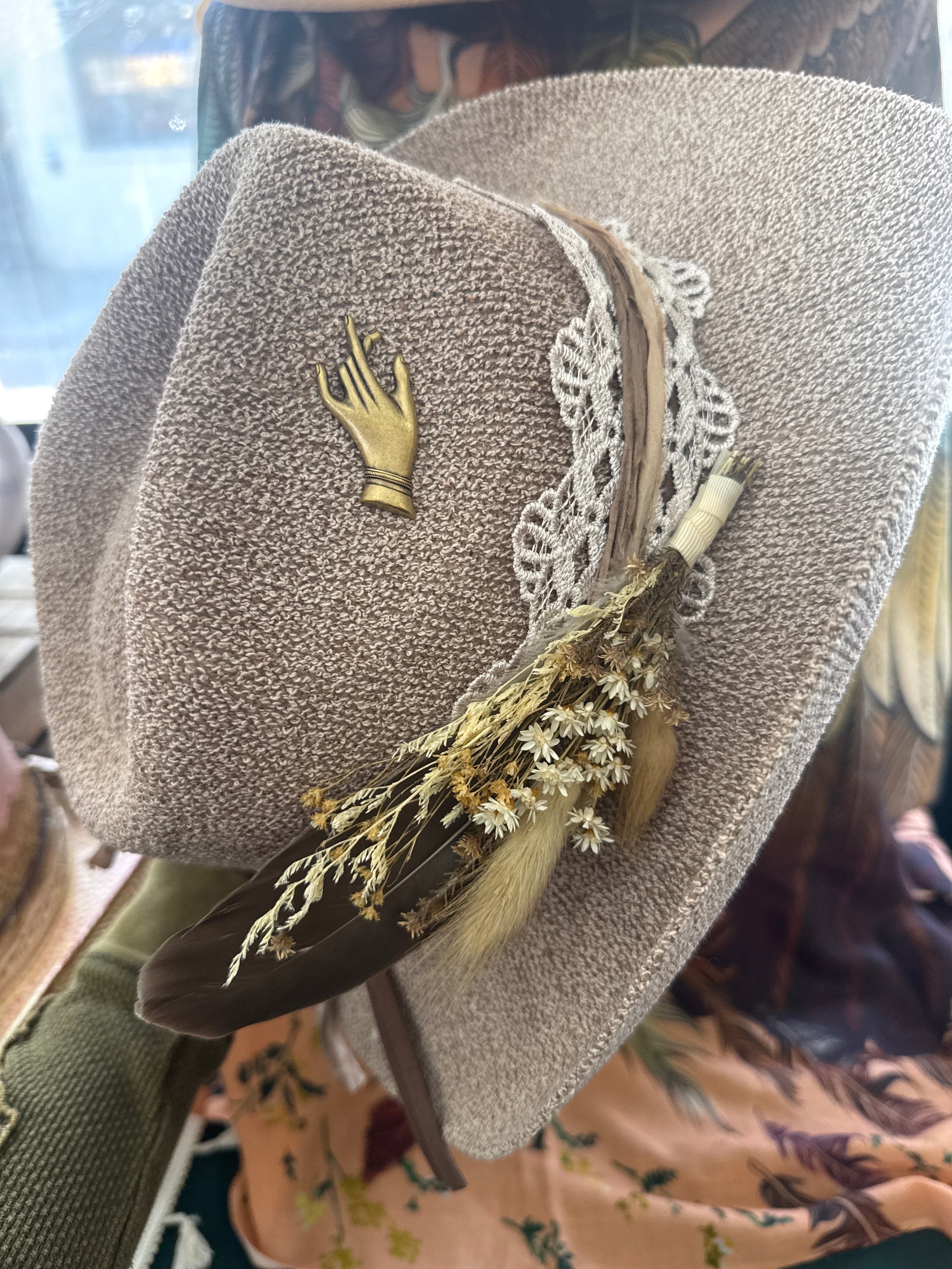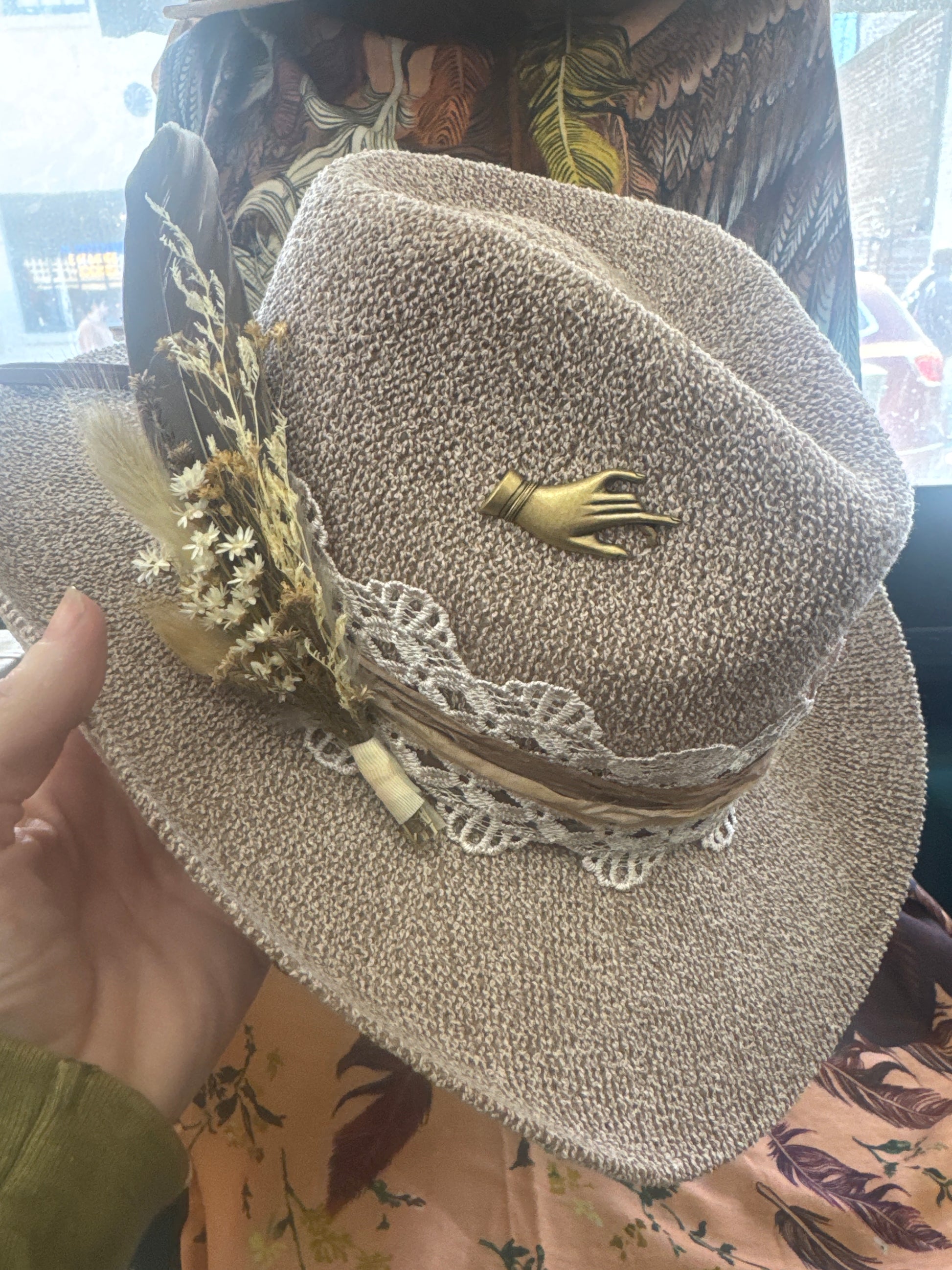 Love this new material. Very soft but slightly stiff. Decorated with gorgeous silk and trim along with local floral/feathers… and very f course a lil brass wing pin. Ready to go!!!