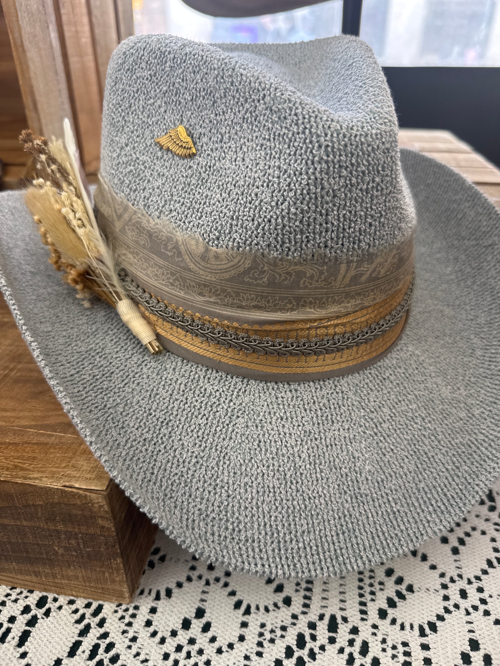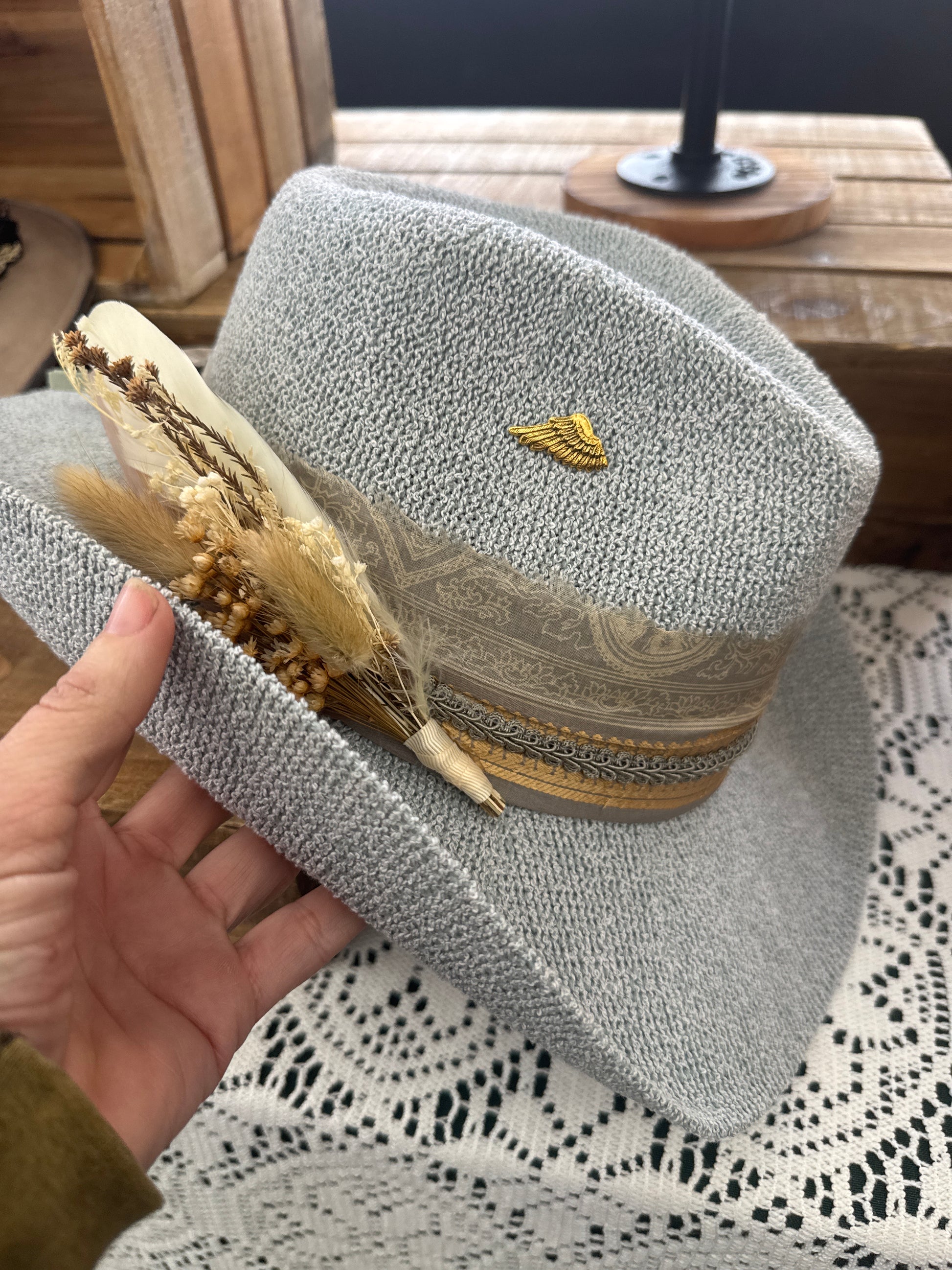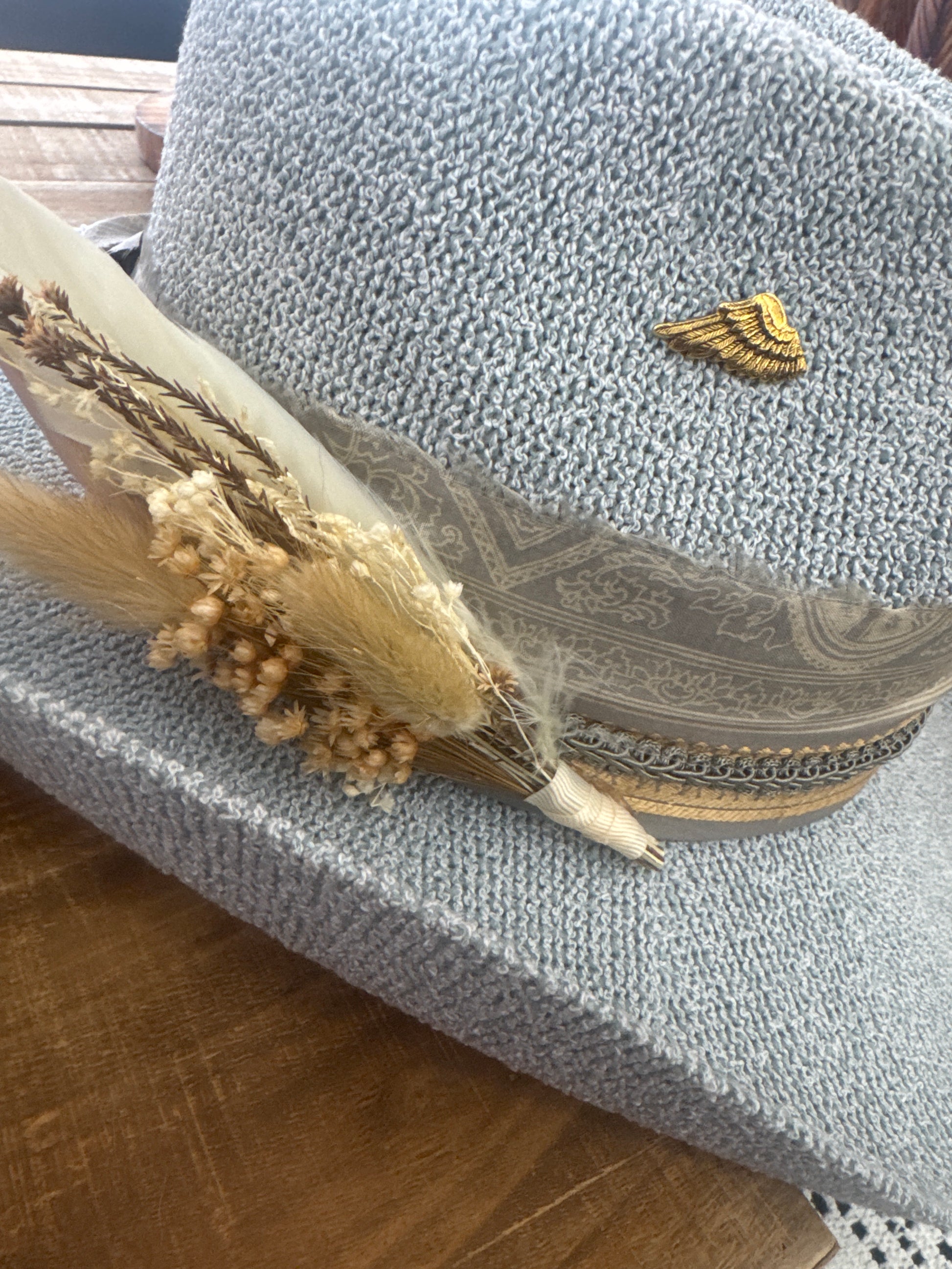 Love this new material. Very soft but slightly stiff. Decorated with gorgeous silk and trim along with local floral/feathers… and very f course a lil brass wing pin. Ready to go!!!