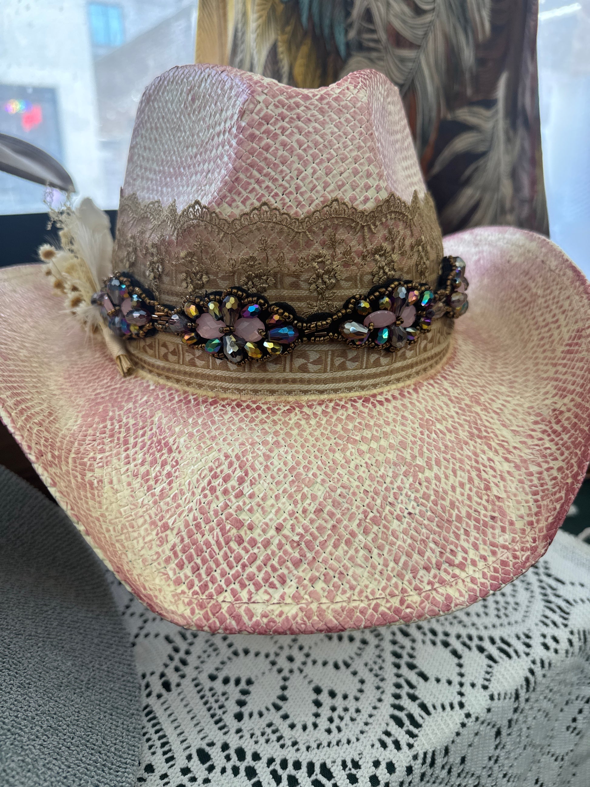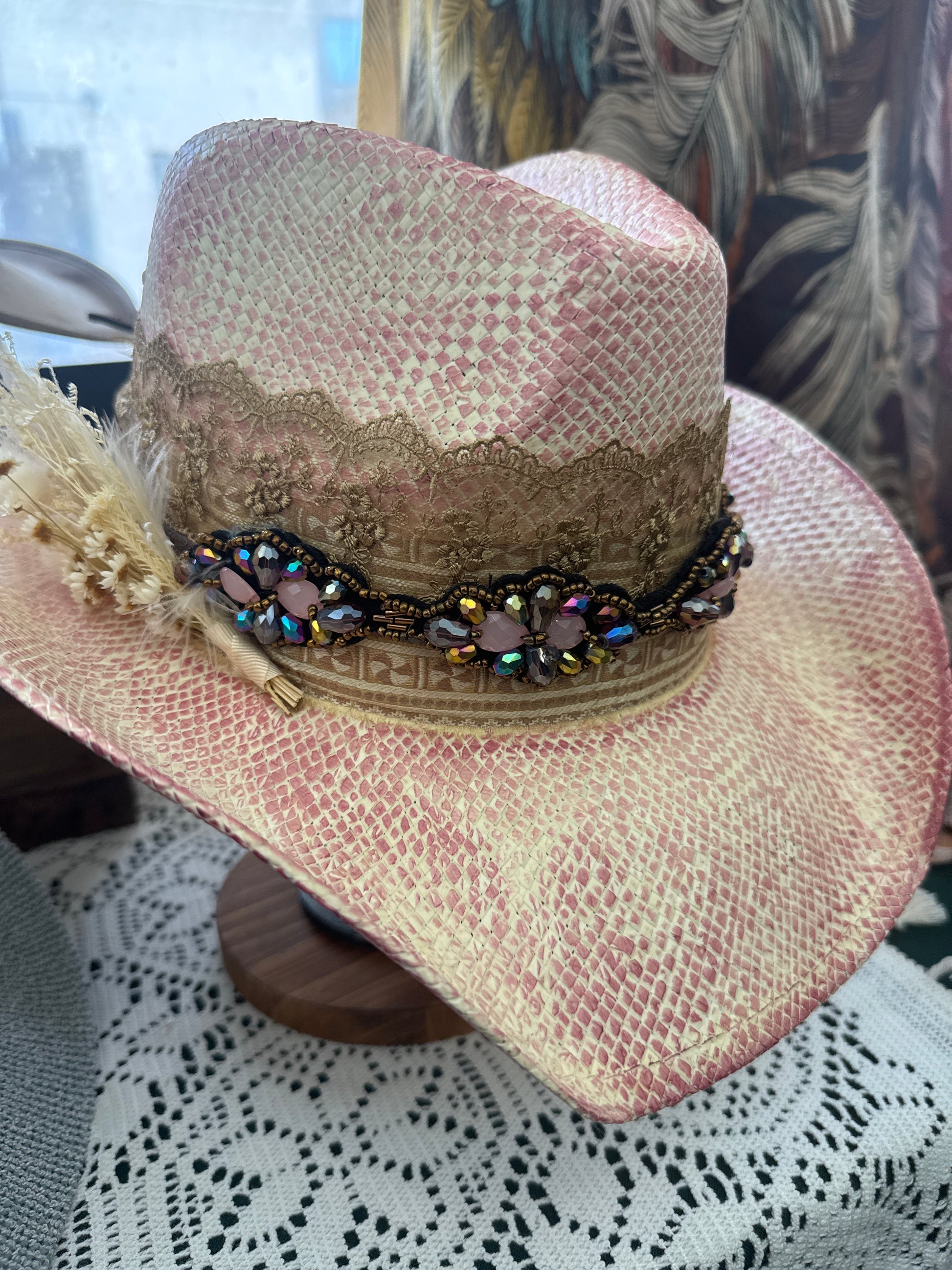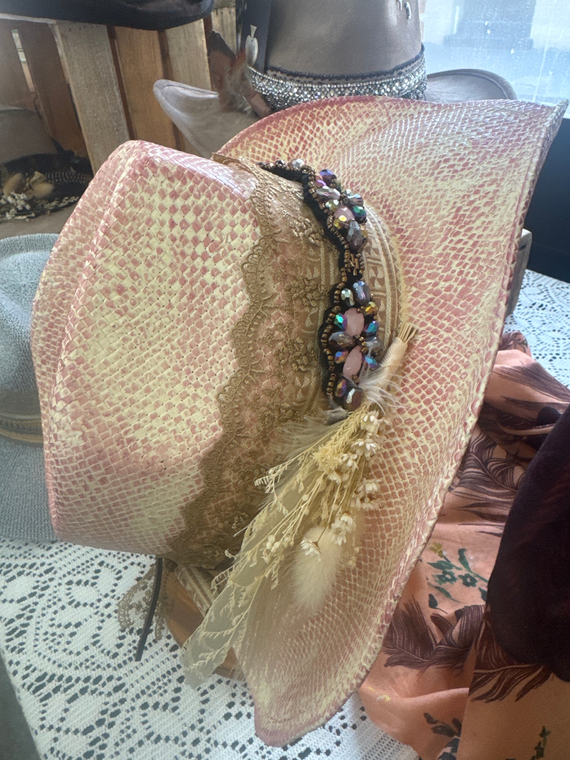 Love love love this stuff pink straw. Featuring vintage silks and laces along with a fun beaded band, and local dried floral and feathers. Ready to go!!!